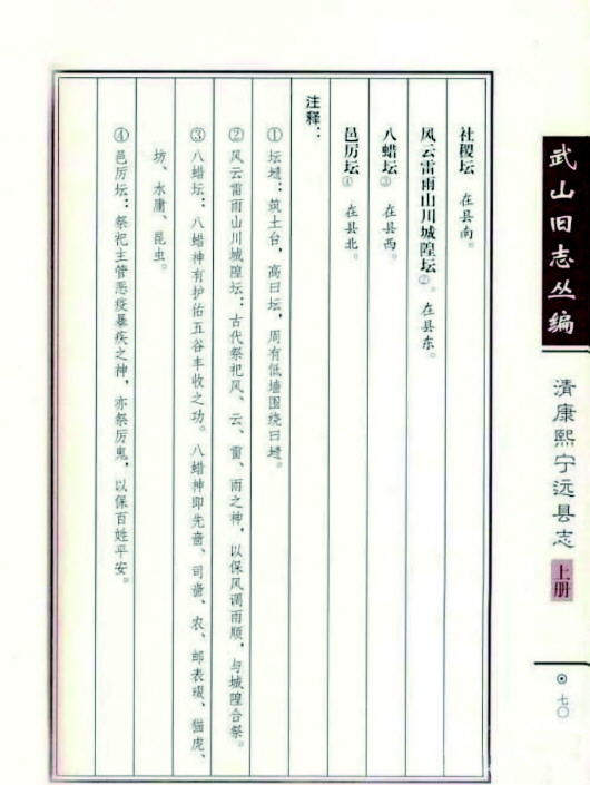 《清康熙寧遠縣志》也有記載:“風云雷雨山川城隍壇,在縣東。古代祭祀風、云、雷、雨之神,以保風調(diào)雨順,與城隍合祭。”“風云雷雨壇”:“在城東郊外,祭用春秋二仲上巳日,設三壇,風云雷雨居中,山川居左,城隍居右,陳設與社稷同,城隍廟與風云雷雨壇合祭。”