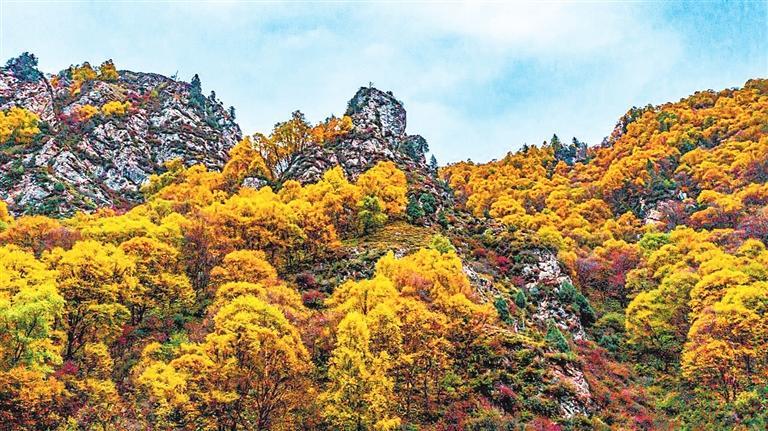 近處山坡人工栽植的落葉松和云杉云鬢輕挽、密密匝匝,白楊林青翠欲滴、亭亭玉立,遠(yuǎn)處異峰林立、斷崖高聳,與藍(lán)天相接,與白云比高,讓人不覺(jué)間心馳神往。