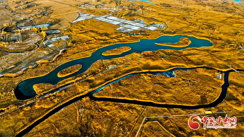 12月1日,俯瞰甘肅張掖國家濕地公園,夕陽余暉映照,金色茂密的蘆葦隨風(fēng)搖曳,蘆花翩翩起舞,碧波蕩漾的水面逐漸凝結(jié)成冰,整個濕地化作一片金色的童話仙境,令人陶醉于無盡的遐想之中。