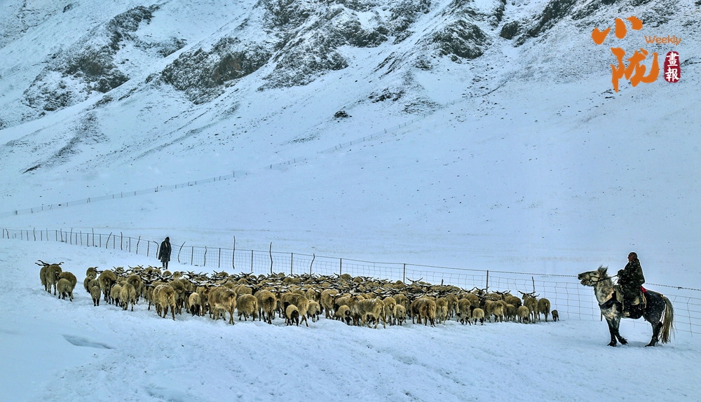 天地一色,萬(wàn)物寂靜,風(fēng)雪牧歸。牧民在雪地里放牧牛羊,人和羊在白雪覆蓋的草原上共同演繹著生活的樂章。