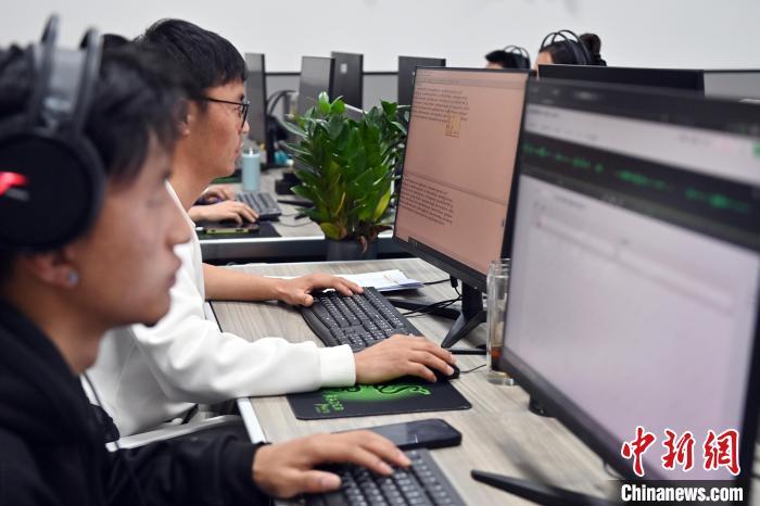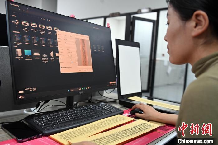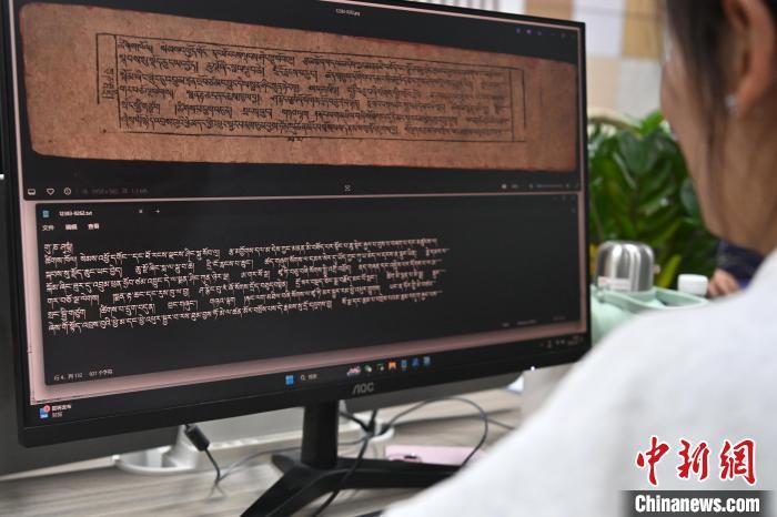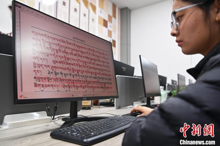 2月27日,在甘肅甘南藏族自治州碌曲縣益西達吉科技有限公司內,工作人員正在進行藏文古籍數(shù)字化相關工作。該公司主要從事民族古籍數(shù)字化建設和古籍文獻數(shù)據(jù)庫建設,自2019年以來,承擔西藏、四川、甘肅等省區(qū)的藏文古籍數(shù)字化項目。圖為工作人員用該公司研發(fā)的藏文信息處理系統(tǒng)對古籍數(shù)字化內容進行檢查。中新社記者 九美旦增 攝