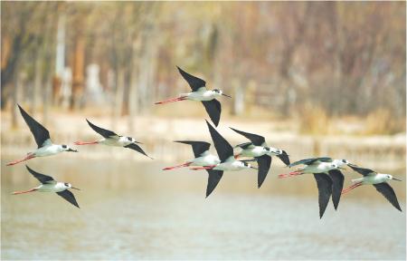 4月9日,一群黑翅長(zhǎng)腳鷸在定西湖水面飛行。進(jìn)入4月,候鳥(niǎo)陸續(xù)北遷,定西湖成了眾多鳥(niǎo)群遷徙途中的歇腳補(bǔ)給地。新定西·定西日?qǐng)?bào)記者 牛小棟 攝