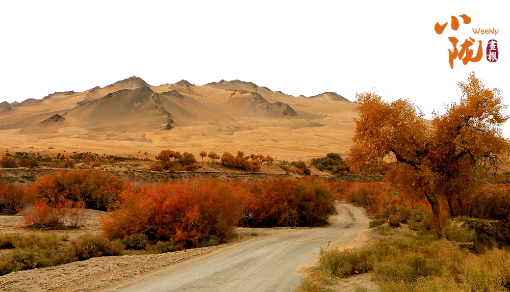 連綿起伏的沙丘如金色浪潮,環(huán)抱著一汪碧水,藍天白云倒映其中。金黃的胡楊在秋風中輕輕搖曳,宛如一群身著華麗服飾的衛(wèi)士,默默守護著這片沙漠中的綠洲。