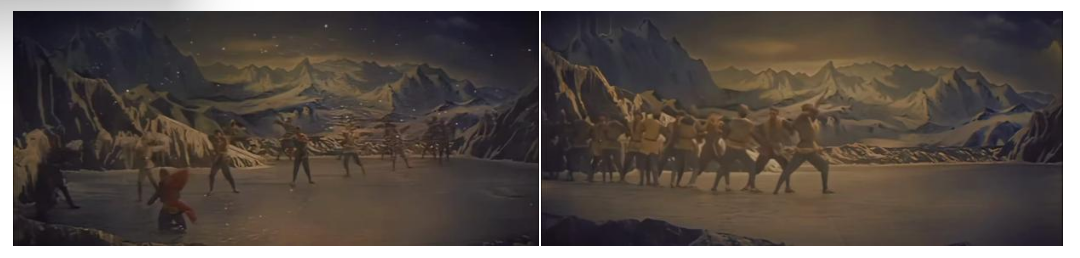 在表現(xiàn)行軍征程時(shí),舞者以身體前傾的大跨步姿態(tài),沿群山布景走出巨大的“S”型曲線。這不是簡單的隊(duì)形變換,它首先在視覺上營造出千軍萬馬綿延不絕的雄渾意象。同時(shí),“S”形曲線本身藝術(shù)化地傳達(dá)了“道路是曲折的,前途是光明的”這一革命哲理。舞者整齊劃一、重心下沉的堅(jiān)定步伐,與沙幕光影營造出的風(fēng)沙漫天效果相結(jié)合,共同體現(xiàn)紅軍在艱難險(xiǎn)阻中依然定向不移的鋼鐵意志。