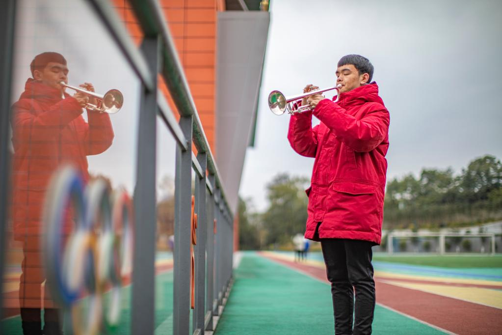 手指在樂章上摸索學(xué)習(xí),手指也在小號的按鍵上上下飛舞。展現(xiàn)出音樂天賦的王太樊,幾乎把課余時間都花在了音樂上。他說,每次吹起小號,他都覺得有一束光從頭頂上照下來,照亮他腳下的路,也照亮他的內(nèi)心世界。“音樂讓我明白,失明沒什么可怕的。只要心是雪亮的,世界就會對你微笑。”