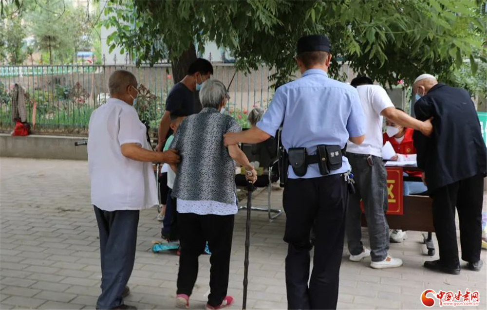 紅古分局海石灣派出所民警在核酸采樣點(diǎn)主動攙扶行動不便的老人進(jìn)行核酸采樣。紅古分局 張 鼎/攝