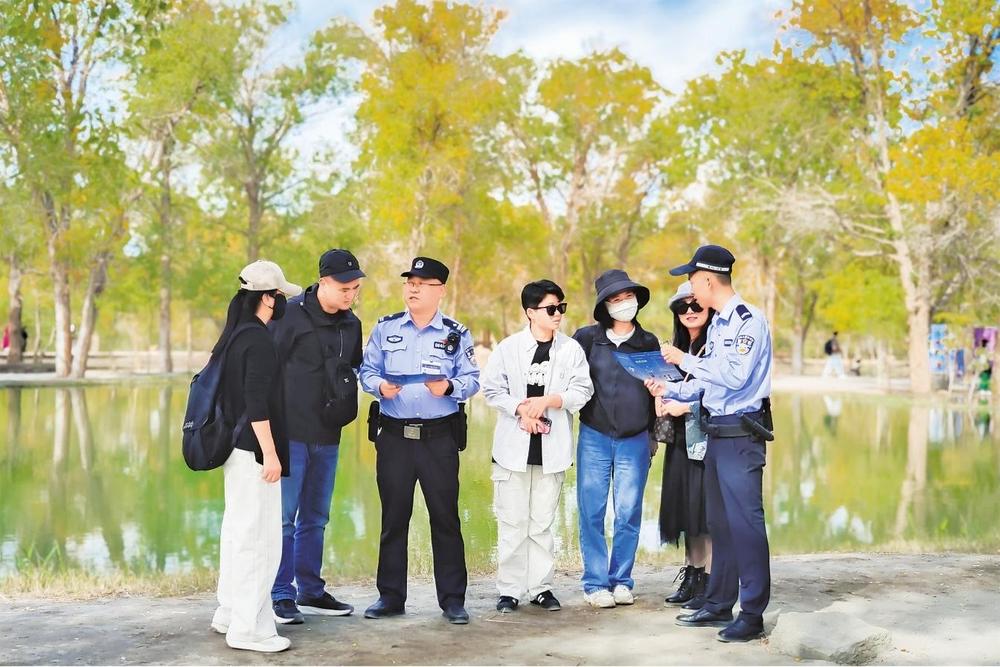同時(shí),運(yùn)用智慧警務(wù)加強(qiáng)對(duì)景區(qū)人流量的動(dòng)態(tài)掌握,適時(shí)調(diào)整巡防策略,在林區(qū)、夜市、游樂場(chǎng)等關(guān)鍵部位,民輔警利用大喇叭播報(bào)安全提示、面對(duì)面宣講等方式,有針對(duì)性開展防火防盜、交通安全、預(yù)防電詐等安全知識(shí)宣傳,向游客傳播“胡楊精神”、講好金塔故事,用“零距離”服務(wù)、全時(shí)空守護(hù)提升游客獲得感、幸福感和滿意度。
