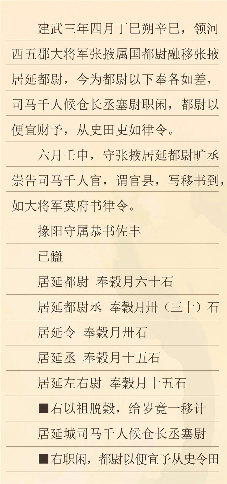 這封冊書記載了建武三年,竇融管轄河西時發(fā)布的一條關于都尉以下官吏奉谷等差的命令。根據竇融發(fā)布的新規(guī)定,我們可以看到,秩比二千石的居延都尉月奉谷僅為六十石,史書有“十斗一斛”及“十斗一石”的記載,此六十石即是六十斛,相比于史書記載中比二千石每月百斛的俸例要少,而其余官吏的俸祿也相應要少,雖然漢代不同時期的官吏俸祿存在變化,但對比所見的這種情況,可能也跟兩漢之交戰(zhàn)亂頻仍的社會環(huán)境有重要關系。(李晶整理)