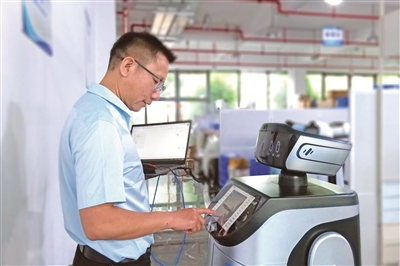 福建省福州市,服務(wù)機器人應(yīng)用技術(shù)員謝茂皇正在對機器人產(chǎn)品的功能進行調(diào)試。周磊 攝