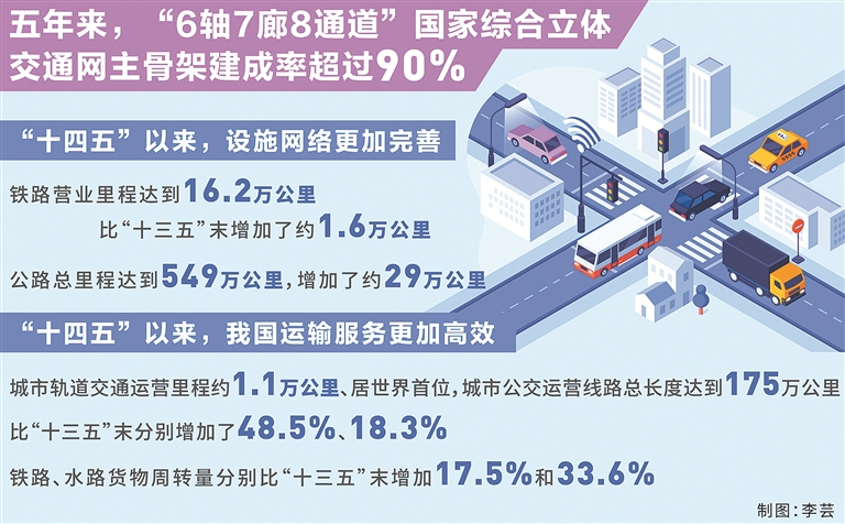 “人員貨物的高效流動彰顯了中國繁榮發(fā)展的活力。在過去一年中,平均每天約有1.8億人次跨區(qū)域出行、每天運送1.6億噸貨物、每天攬收4.78億件快遞。”劉偉說,“十四五”以來,我國運輸服務更加高效,軌道交通、常規(guī)公交、慢行交通網(wǎng)絡融合發(fā)展,城市軌道交通運營里程約1.1萬公里、居世界首位,城市公交運營線路總長度達到175萬公里,比“十三五”末分別增加了48.5%、18.3%。鐵路、水路貨物周轉量分別比“十三五”末增加17.5%和33.6%,港口集裝箱鐵水聯(lián)運量年均增速約15%。去年,全社會物流成本節(jié)約超過4000億元,其中交通運輸成本降低了約2800億元。