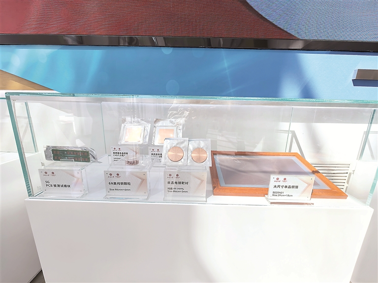 在懷柔科學城的核心區(qū)域,坐落著占地面積12.6畝的輕元素量子材料交叉平臺。走進大廳,玻璃展示柜中擺放著銅基石墨烯復合線、大尺寸單晶銅箔、6N高純銅顆粒等一系列尖端材料。其中,一款圓形透明的12英寸單層二硫化鉬薄膜格外引人注目,平臺工作人員王異楠告訴記者,這是現(xiàn)有技術(shù)下能做出的直徑最大的單層二硫化鉬薄膜,主要應(yīng)用在激光器領(lǐng)域。