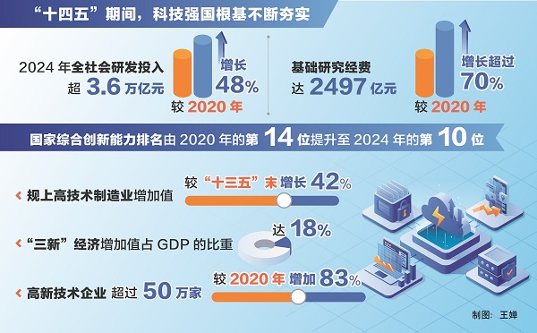 “這五年,科技創(chuàng)新能力穩(wěn)步提升,科技強國根基不斷夯實。”陰和俊說,我國科技投入持續(xù)增加,2024年全社會研發(fā)投入超3.6萬億元,較2020年增長48%;基礎研究經費達2497億元,較2020年增長超過70%,在量子科技、生命科學、物質科學、空間科學等領域取得一批重大原創(chuàng)性成果;國家實驗室體系建設穩(wěn)步推進,國家科研機構、高水平研究型大學科研能力不斷提升,科技領軍企業(yè)加快培育成長;北京、上海、粵港澳大灣區(qū)國際科創(chuàng)中心支撐引領和輻射帶動作用不斷增強,深圳-香港-廣州躍居全球百強創(chuàng)新集群榜首;國家綜合創(chuàng)新能力排名由2020年的第14位提升至2024年的第10位。