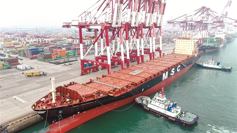 1月4日,澳洲直航新航線首班船舶靠泊山東港口青島港,標(biāo)志著該港2026年首條外貿(mào)新航線正式開通。圖為澳洲直航新航線首班船舶——“地中海杰西尼亞”輪靠泊山東港口青島港。新華社發(fā)(張進(jìn)剛 攝)
