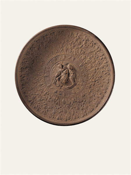 公元2-3世紀(jì),靖遠(yuǎn)縣征集,高4.6厘米,口徑31厘米,足徑10.9厘米。銀質(zhì)鎏金,以鑄造、錘鍱等工藝制成,鎏金已大部脫落。圓形,卷唇,斜孤壁,圈足。盤內(nèi)壁滿飾浮雕花紋,分3圈列置。外圈飾勾聯(lián)的葡萄卷草紋藤蔓,其間棲息30余只禽鳥等動(dòng)物。中圈外緣飾細(xì)小聯(lián)珠紋,內(nèi)周環(huán)列12個(gè)頭像,頭像間為禽鳥等動(dòng)物,或?yàn)橄ED神話中的奧林匹斯山12神。中心為一高浮雕裸體男性,卷發(fā)無須,身披長(zhǎng)巾,右手持圖爾索斯杖,杖首為松果狀飾物,為希臘神話中的酒神狄俄尼索斯。酒神倚一花豹而坐,鼻梁凸出,側(cè)首張口,頸下帶花環(huán),身上遍布圓斑。盤底圈足內(nèi)有一行刻作虛點(diǎn)的銘文,銘文年代晚于做器年代。此件器物發(fā)現(xiàn)于絲綢之路甘肅段的黃河渡口,是研究中西交流重要的實(shí)物資料,也是十分罕見的絲綢之路遺珍。