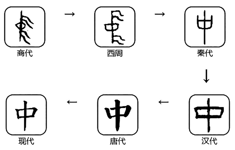 甲骨文“中”象旗幟之形,其上下部都有飄帶。直線的中間加上圈形指示符號(hào),表示中央、中點(diǎn)等一般含義。秦系簡(jiǎn)牘的“中”字省略了象征斿的部分,小篆和隸書(shū)字形中間的圈形又變?yōu)榉叫?,成為了現(xiàn)在楷書(shū)的“中”。