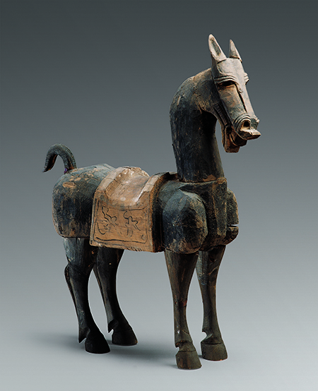 漢代,武威市磨嘴子漢墓出土。高87厘米,長72厘米。木馬形體高大,張嘴嘶鳴,四足直立,作佇立狀。通體涂黑,用刀刻出眼、鼻、唇,尾后舉下垂。馬鞍用白粉涂底,上以黑色勾畫出云氣紋。整體造型雄渾質(zhì)樸,生動(dòng)傳神。