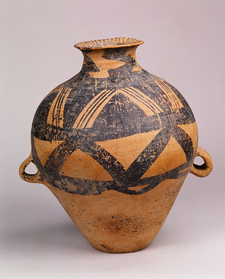 馬家窯文化馬廠類(lèi)型,高37厘米,底徑10厘米。侈口,短頸,圓肩鼓腹,下腹內(nèi)收,平底,雙腹耳。