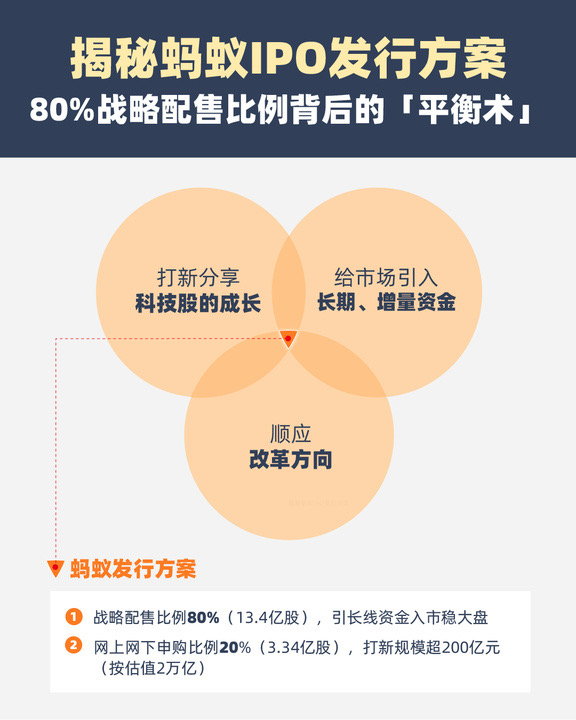 10月21日,科創(chuàng)板IPO獲證監(jiān)會(huì)同意注冊(cè)后,螞蟻集團(tuán)更新招股意向書(shū)并公布上市發(fā)行計(jì)劃。中證君發(fā)現(xiàn),螞蟻設(shè)置了較高的戰(zhàn)配比例以穩(wěn)定市場(chǎng):戰(zhàn)略配售股票數(shù)占初始發(fā)行量的80%,約13.4億股。