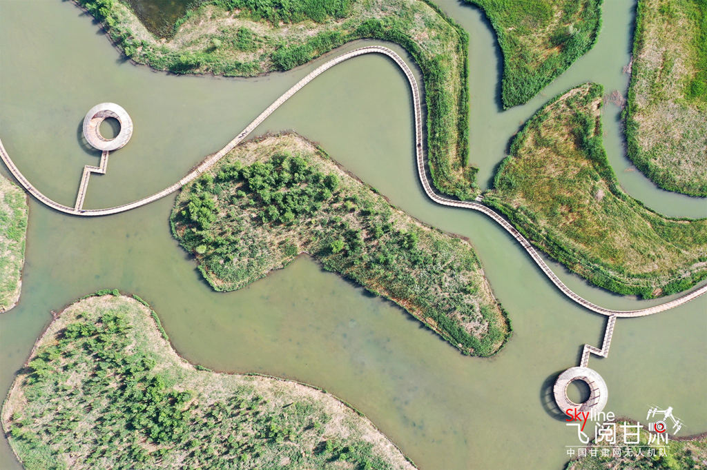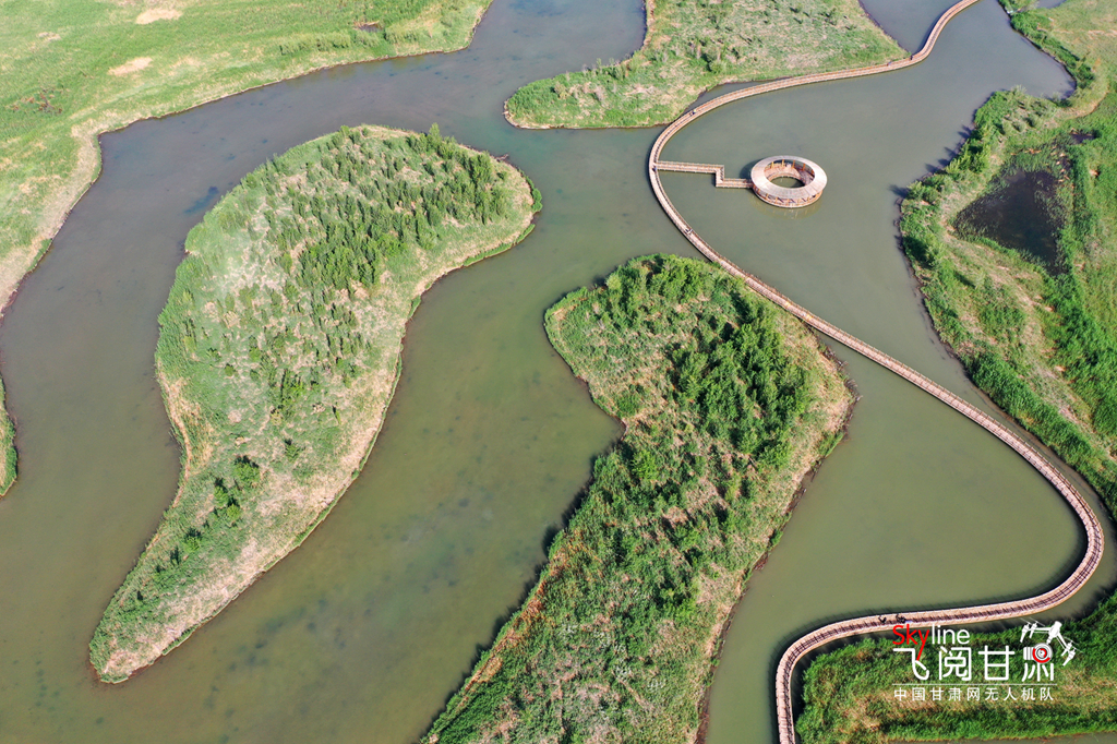 5月24日,甘肅省張掖國家濕地公園內(nèi)碧波蕩漾,湖面、樹木翠色欲滴,宛如一幅只用綠色渲染不用墨線勾勒的夏日畫卷。(無人機航拍)