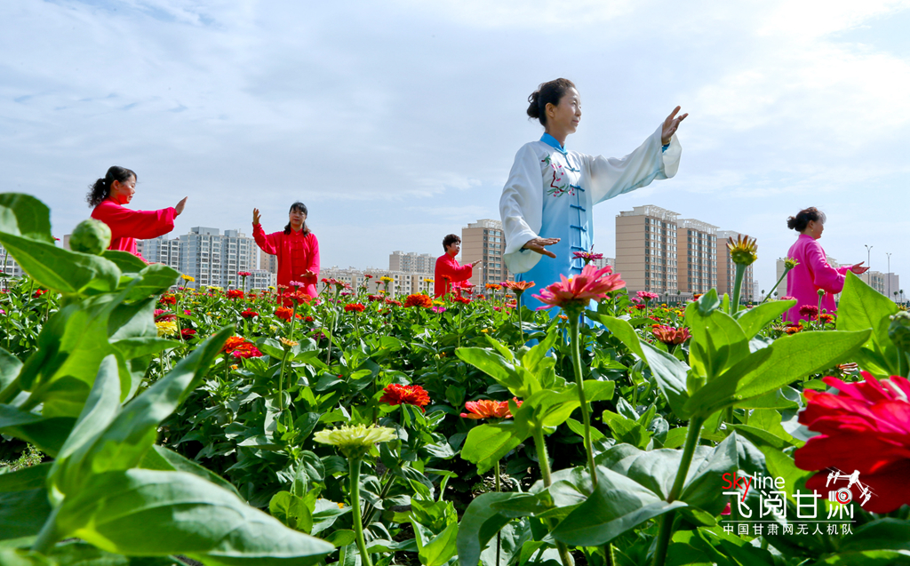 7月8日清晨,甘肅張掖甘州區(qū)順祥名苑小區(qū)南側(cè)的123畝裸露土地綠化美化點上,各種鮮花競相綻放,花香四溢,綠意盎然,太極拳練習(xí)愛好者正在練習(xí)太極拳。