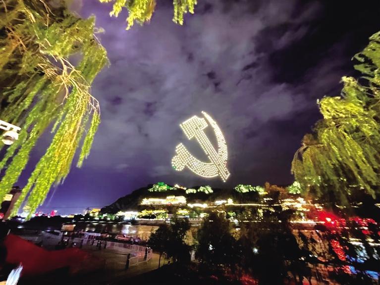 中國(guó)甘肅網(wǎng)7月1日訊 據(jù)蘭州日?qǐng)?bào)報(bào)道(記者 王瀟旋 攝)為慶祝中國(guó)共產(chǎn)黨成立100周年,6月30日晚,深圳、合肥、鄭州、蘭州等地上演光影盛宴。蘭州用燈光和無(wú)人機(jī)扮靚城市夜空,為黨的生日獻(xiàn)上璀璨光影華美的祝福。