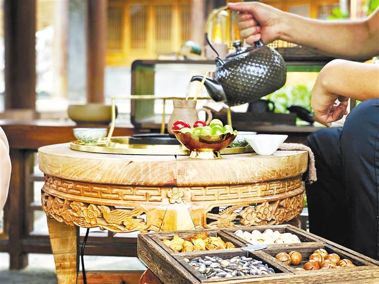晚飯后是上座活躍期,一撥撥客人或隨意落座在古色古香的四合院長(zhǎng)廊間,或穿堂入室端坐里間,聊天打趣侃侃而談,“搗”茶品茗各取所好,一天的疲乏與負(fù)累不知不覺(jué)間隨著那一刻輕溫慢煮的好時(shí)光,消散殆盡。