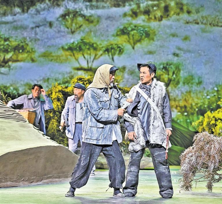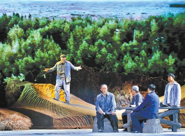 現(xiàn)實(shí)題材是話劇藝術(shù)的寵兒,在話劇進(jìn)入中國(guó)一百多年的時(shí)光中,現(xiàn)實(shí)題材創(chuàng)作占據(jù)相當(dāng)大的比例。在近當(dāng)代中國(guó)歷史的進(jìn)程中,話劇始終起著敢為天下先、針砭時(shí)弊的作用,但話劇又有其極其特殊的藝術(shù)框范。人們?cè)谟^看話劇時(shí),仿佛就是在觀看自己的人生,觀看自己和身邊最熟悉的人們,這是話劇藝術(shù)獨(dú)具的極高的審美要求。尤其是現(xiàn)代題材的創(chuàng)作,稍有不慎便會(huì)陷入同質(zhì)化的僵硬模式,使舞臺(tái)藝術(shù)失去應(yīng)有的美感。話劇《八步沙》讓6個(gè)老漢成為舞臺(tái)聚光燈下的主角,體現(xiàn)了創(chuàng)作者們呼應(yīng)時(shí)代之需,為最普通的農(nóng)民寫(xiě)生立傳的拳拳之心。6個(gè)老農(nóng)民談不上人們通常意識(shí)中的“美”,“治沙”這樣的故事也相對(duì)比較單調(diào),不大容易出彩,而創(chuàng)作者們以八步沙這個(gè)真實(shí)的地名作為劇名,以“六老漢”治沙這個(gè)真實(shí)的事件作為全劇的敘述內(nèi)容,卻能宕開(kāi)一筆把特定的外部環(huán)境與人物的內(nèi)心世界巧妙地融為一體,為全劇注入了濃郁飽滿的戲劇情境和情感,使這部話劇有了獨(dú)屬于自己的一份力度、一份無(wú)法替代的光彩。全劇的情節(jié)一曲三折,以小見(jiàn)大,當(dāng)黑壓壓的沙塵暴鋪天而來(lái)的時(shí)候,當(dāng)六老漢在嚴(yán)酷的環(huán)境中吃盡苦頭,摸索出“一棵樹(shù),一把草,壓住沙子防風(fēng)掏”的寶貴經(jīng)驗(yàn),使漫無(wú)邊際的沙漠終于出現(xiàn)一抹綠色,繼而眼看著一棵又一棵綠樹(shù)成活成林,終于成為一片綠洲的時(shí)候,我相信觀眾的心也被藝術(shù)琴弦撥動(dòng),始終被劇情牽著走,為劇中人物的命運(yùn)擔(dān)心、懸心、痛心、開(kāi)心,從中深深地感受到劇中所蘊(yùn)藏的豐富內(nèi)涵和它所傳達(dá)出的真切意趣。