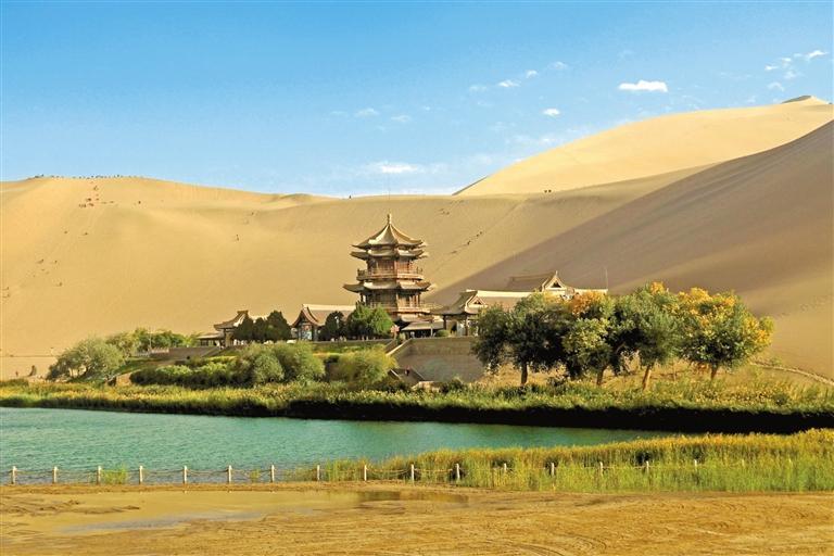這是10月4日拍攝的甘肅省敦煌市鳴沙山月牙泉景區(qū)。金秋時(shí)節(jié),神州大地秋景如畫,盡顯大美中國(guó)山河錦繡。 新華社照片