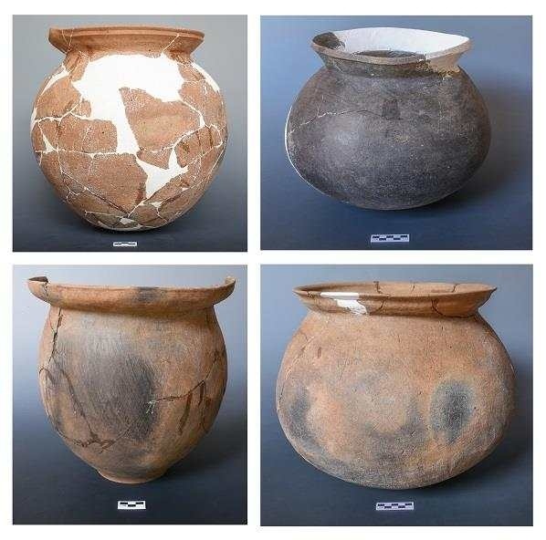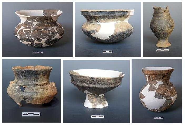 古城村遺址面積約4.2萬(wàn)平方米,現(xiàn)存的貝丘堆積最厚處達(dá)6.5米,由大量尾部被敲破的螺螄殼與灰土層交替堆疊形成。碳十四測(cè)定年代為距今3600至2500年,約相當(dāng)于中原地區(qū)的商代至兩周時(shí)期。商代遺存可分為早晚兩段,早段發(fā)現(xiàn)保存完整的橢圓形環(huán)壕聚落,由中心臺(tái)地、外圍環(huán)壕和護(hù)坡組成,中心臺(tái)地面積約27000平方米,環(huán)壕和護(hù)坡周長(zhǎng)約600米,這種聚落格局一直延續(xù)至兩周時(shí)期。商代晚段發(fā)現(xiàn)一批土坑墓和甕棺葬。兩周時(shí)期的遺存以房址、螺殼堆、灰燼、活動(dòng)面等居住類遺跡為主,房址多為方形半地穴式。出土青銅器、陶器、玉器、石器、骨器、木器等文物4000余件。