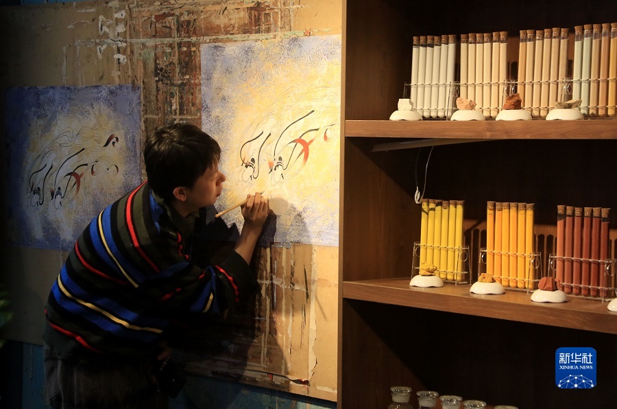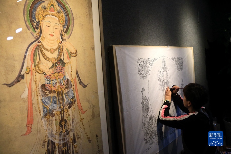 2月22日,在敦煌小鎮(zhèn)鳴沙書院,來自陜西的學(xué)員吳恩梵學(xué)習(xí)敦煌壁畫臨摹技藝。