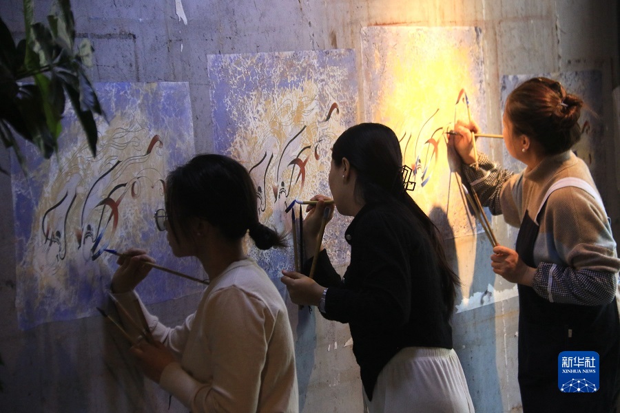 2月22日,在敦煌小鎮(zhèn)鳴沙書院,學(xué)員學(xué)習(xí)敦煌壁畫臨摹技藝。