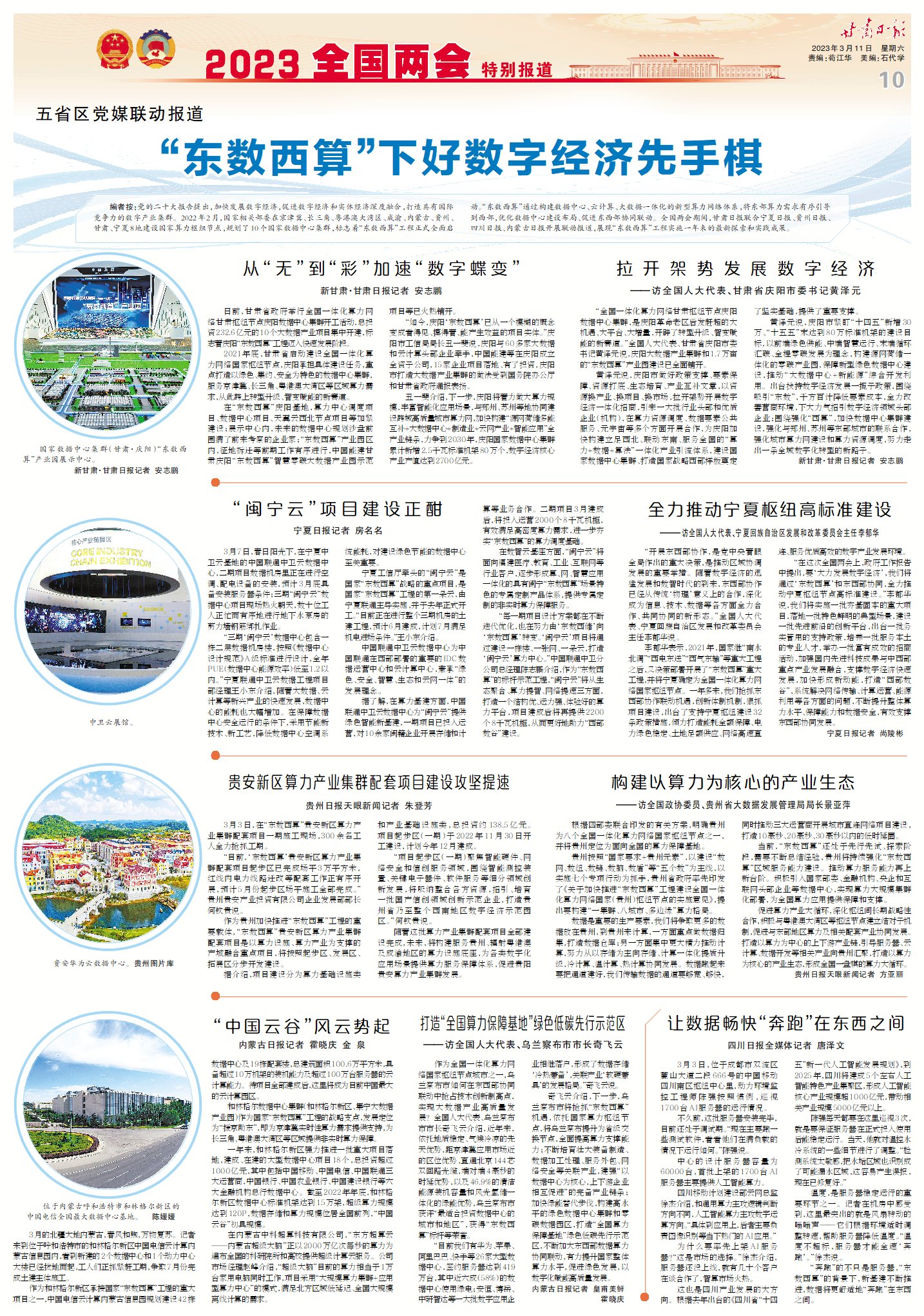 編者按:黨的二十大報告提出,加快發(fā)展數(shù)字經(jīng)濟(jì),促進(jìn)數(shù)字經(jīng)濟(jì)和實(shí)體經(jīng)濟(jì)深度融合,打造具有國際競爭力的數(shù)字產(chǎn)業(yè)集群。2022年2月,國家相關(guān)部委在京津冀、長三角、粵港澳大灣區(qū)、成渝、內(nèi)蒙古、貴州、甘肅、寧夏8地建設(shè)國家算力樞紐節(jié)點(diǎn),規(guī)劃了10個國家數(shù)據(jù)中心集群,標(biāo)志著“東數(shù)西算”工程正式全面啟動。“東數(shù)西算”通過構(gòu)建數(shù)據(jù)中心、云計算、大數(shù)據(jù)一體化的新型算力網(wǎng)絡(luò)體系,將東部算力需求有序引導(dǎo)到西部,優(yōu)化數(shù)據(jù)中心建設(shè)布局、促進(jìn)東西部協(xié)同聯(lián)動。全國兩會期間,甘肅日報聯(lián)合寧夏日報、貴州日報、四川日報、內(nèi)蒙古日報開展聯(lián)動報道,展現(xiàn)“東數(shù)西算”工程實(shí)施一年來的最新探索和實(shí)踐成果。