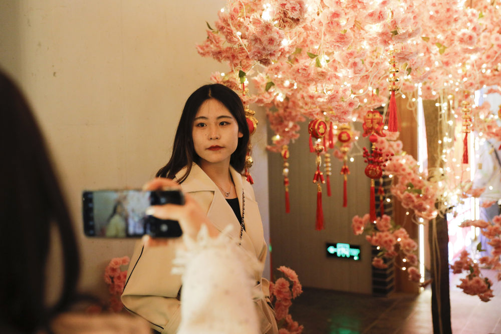 ↑3月25日,游客在“黃河食渡文化夜市”拍照留念。