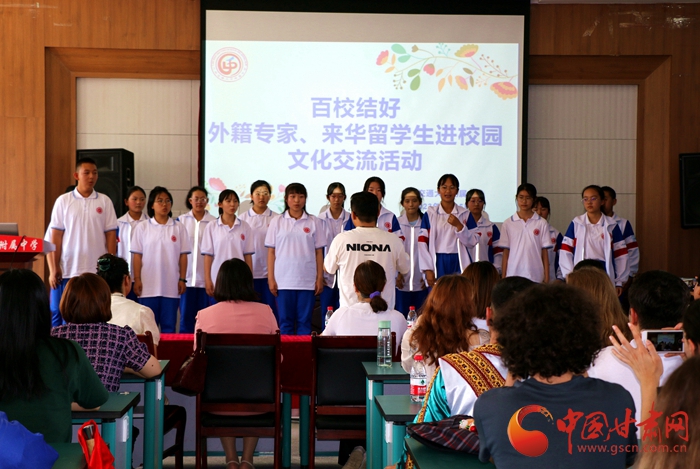 中國甘肅網(wǎng)6月26日訊 (西北角·中國甘肅網(wǎng)記者 張?zhí)m琴)6月25日下午,“百校結(jié)好”倡議之“外籍專家、來華留學(xué)生進(jìn)校園”文化交流活動在蘭州交通大學(xué)附屬中學(xué)舉行。來自蘭州交通大學(xué)國際交流學(xué)院的外籍教師、來華留學(xué)生與該校師生熱情的互動交流,為今年“百校結(jié)好”倡議系列活動締結(jié)友誼之花再結(jié)“碩果”。