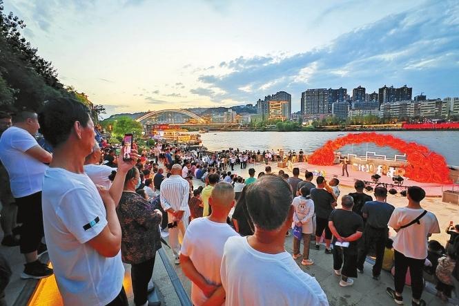 19日,游客在黃河岸邊欣賞黃河之濱百日千場(chǎng)音樂展演活動(dòng)。新華社照片
