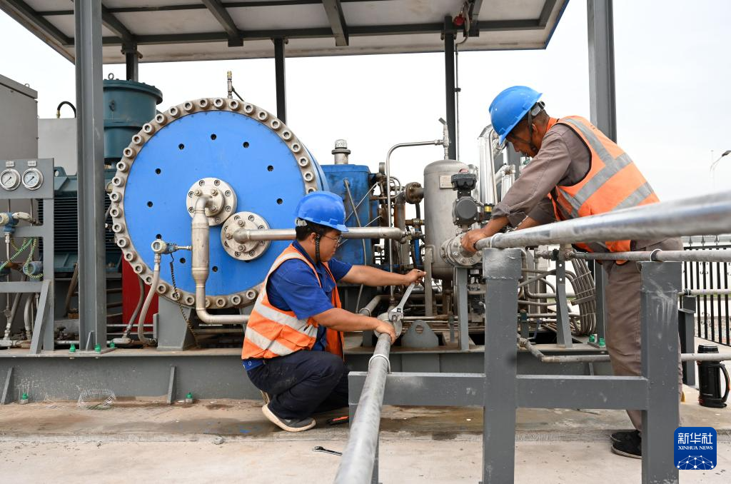 8月10日,工人在中國(guó)能建張掖氫能綜合應(yīng)用示范項(xiàng)目調(diào)試氫氣加壓裝置。新華社記者 金良快 攝