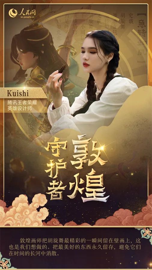 在敦煌千里之外的地方,騰訊的設計師們正在研發(fā)新的敦煌文化創(chuàng)新產(chǎn)品。熱門游戲《王者榮耀》的角色美術(shù)師Kuishi以莫高窟第220窟的壁畫為原型,為游戲角色設計了全新皮膚,將盛行于唐代的胡旋舞融入現(xiàn)代元素。