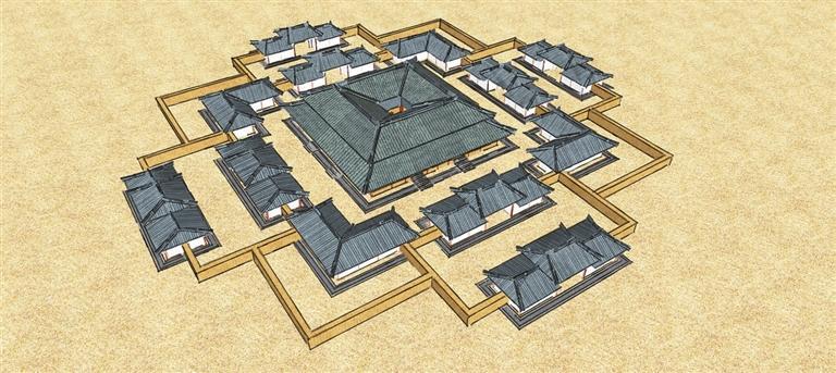 在中心夯土臺基四邊外約6.3米處平行分布有長方形附屬建筑,四角分布有曲尺形附屬建筑,對應(yīng)位置的附屬建筑結(jié)構(gòu)完全相同。長方形附屬建筑周圍有鵝卵石鋪就的散水環(huán)繞,其內(nèi)有兩個相對的方形土臺,邊緣有柱洞,土臺外端中部連接夯土矮墻延伸至曲尺形建筑。四角曲尺形附屬建筑周圍亦有散水環(huán)繞,臺基邊緣有柱洞,曲尺形六邊各有一級空心磚踏步。臺基上有若干規(guī)律分布的扁平狀青石,推測應(yīng)為室內(nèi)立柱的礎(chǔ)石。曲尺形建筑的功能應(yīng)該是連接兩邊的長方形建筑,同時還要兼顧外圍次一級附屬建筑的連接。各建筑散水周圍均鋪設(shè)回紋地磚,各臺基周邊散落著瓦礫堆積。