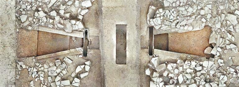 在考古發(fā)現(xiàn)中,我們注意到地磚磚縫采用了高超的填縫技術(shù),形成了密封的地面,地磚鋪設(shè)有一定坡度,使得半地穴內(nèi)地面由四邊到中部形成約0.1米的落差。地面上各處疊壓多件檐頭筒瓦和瓦當(dāng),由此可證明此半地穴空間上方露天,沒有屋檐,應(yīng)為建筑中心天井。H1北壁有一節(jié)被破壞的陶水管接口,經(jīng)解剖發(fā)現(xiàn)該陶水管向北穿過夯土高臺,在其北部散水處將半地穴天井中的落水排出。半地穴空間的四壁殘留上下兩排整齊排列的鐵釘,橫向釘在夯土壁上,應(yīng)為固定壁磚之用,殘存壁磚邊緣可見填縫材料,經(jīng)檢測填縫劑為生石灰混合少量石英砂顆粒的無機(jī)質(zhì)材料,類似今天的“水泥”。