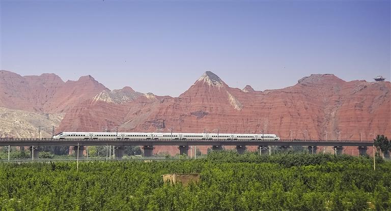 在這里,通紅的山體被風(fēng)蝕出獨(dú)特的形狀,不同巖石礦物讓山體呈現(xiàn)五彩的顏色,在湛藍(lán)天空下越發(fā)艷麗奪目??展扔朴浦袝r(shí)而傳來轟鳴,白色游龍?jiān)谏介g舞動(dòng),風(fēng)馳電掣駛過絕美丹霞,大自然的鬼斧神工與現(xiàn)代科技的智慧結(jié)晶交相輝映,共同構(gòu)成一幅瑰麗的畫卷。等待、抓拍、回看……“發(fā)現(xiàn)團(tuán)”的成員們在烈日下不斷重復(fù)著相同的動(dòng)作,在這里領(lǐng)略蘭新高鐵動(dòng)車組列車穿越火紅丹霞的精彩瞬間,時(shí)刻端起手中的相機(jī),不斷記錄復(fù)興號動(dòng)車組與錦繡山河同框的壯觀畫面,感受繁忙的西部高鐵。