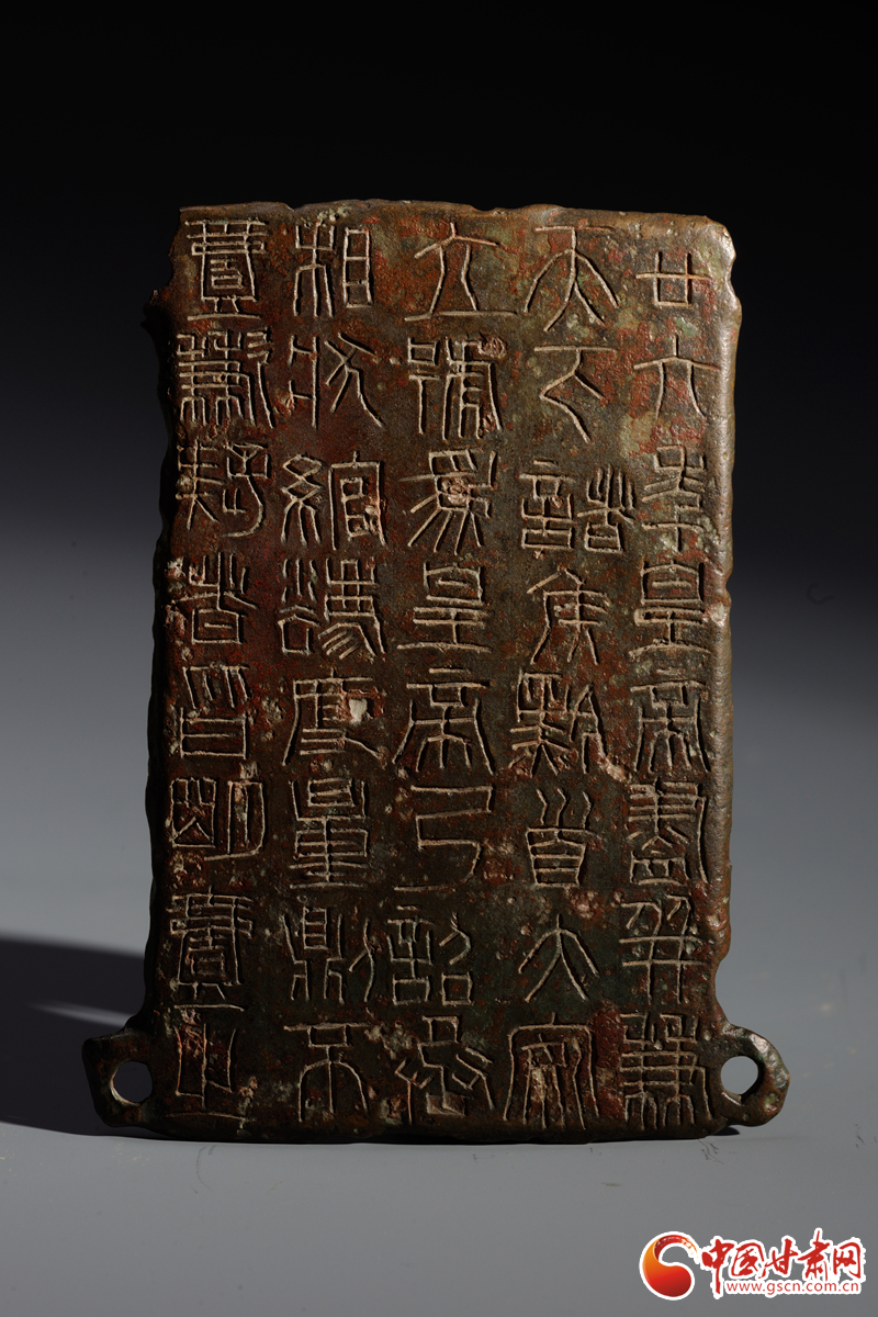 中國甘肅網(wǎng)9月14日訊(西北角·中國甘肅網(wǎng)記者 孫珩力)秦詔版,是指刻有秦始皇或秦二世統(tǒng)一度量衡詔書的銅版,有的鑲在鐵權(quán)、銅權(quán)上;有的四角有孔,用以釘在木頭的量器上。目前我國出土的刻有秦始皇詔文的遺物有銅橢量、銅錢等,不僅數(shù)量多而且分布也廣,而像這樣把詔文刻在銅版上的詔版形式在全國極為罕見,鎮(zhèn)原縣博物館收藏的就是其中之一,可謂稀世珍品。