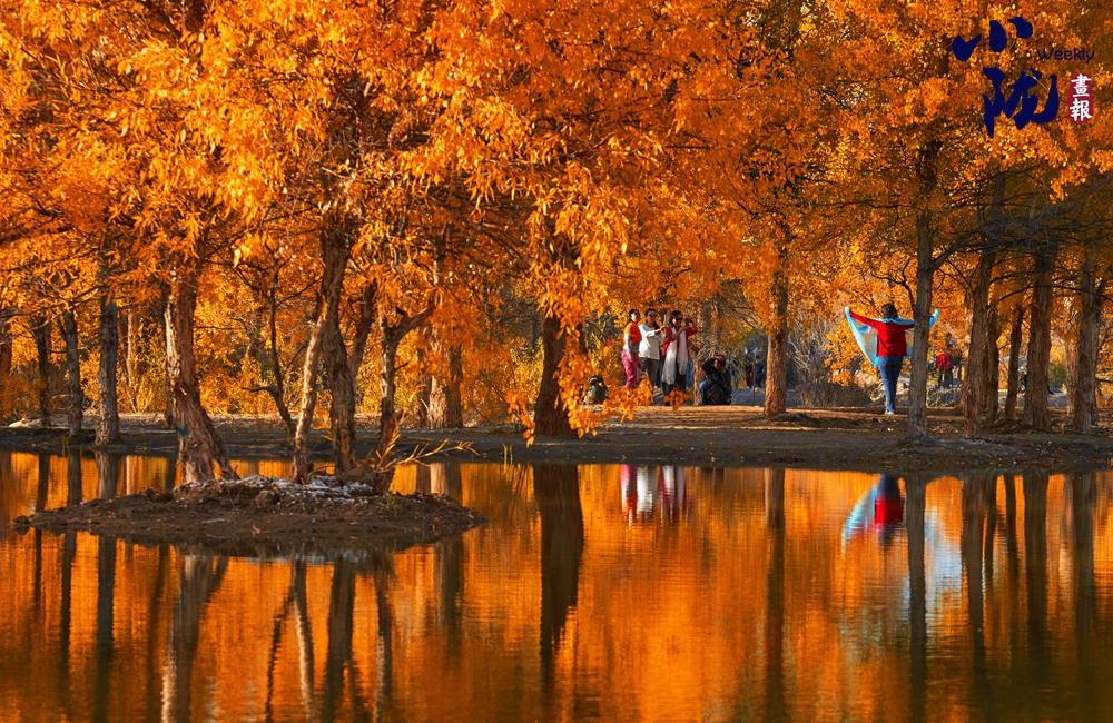 湛藍(lán)的天空、清澈的湖水、倒影的胡楊、金色的落葉,斑斕得如同油畫色彩。
