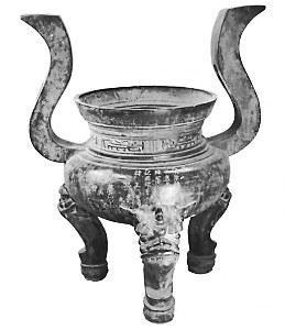 明崇禎三年韓王亶公式造銅鼎:鼎高1.01米,口徑0.493米。侈口斜沿,內(nèi)折窄唇,束頸,溜肩,“S”形對(duì)稱高耳,鼓腹,圜底,獸面吐舌形三高足,足跟缽形。頸上部飾凸弦紋四道,頸中部浮雕夔龍六條,雷紋襯地,頸下部飾三道凸弦紋,肩形二道凸弦紋。腹部鏨刻紀(jì)年、造者、監(jiān)造、工匠等銘文59字。