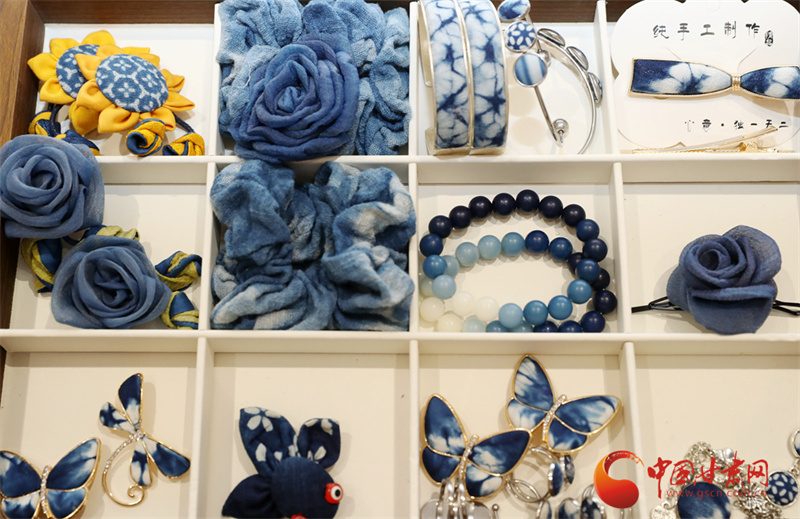 染好的布匹還要經(jīng)過脫漿、清洗、陰干,最后才是拆線、整理。當一塊完整的藍印花布展現(xiàn)在眼前時,李梅總會輕輕撫摸布料,仿佛在與草木對話。她的工作室里,掛滿了用藍染制成的物件:桌布上印著成片的板藍根葉,茶席邊緣綴著小巧的藍染布扣,就連她日常穿的棉麻衫,也是自己染的淡藍色。“這些布不是冰冷的商品,是帶著土地溫度的生活。”李梅說,去年她在平?jīng)龉懦情_了一間“藍染生活館”,游客可以跟著她學(xué)種板藍根、體驗扎染,很多人第一次發(fā)現(xiàn),原來衣服上的藍色可以來自田野,非遺技藝能如此貼近日常。