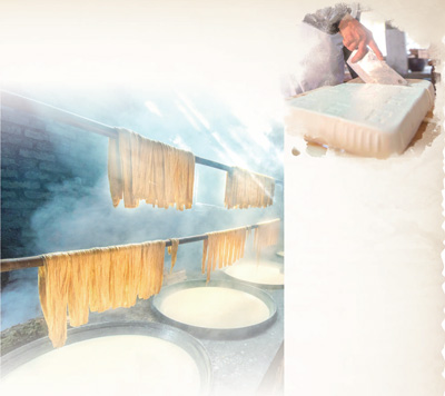 農(nóng)家豆腐講究口感,個頭飽滿的土黃豆,清冽甘甜的山泉水,酸度適中的漿水湯,農(nóng)家傳統(tǒng)的柴火灶,是必不可少的四件料。缺一樣,山野豆子就不能在清水中爆裂出植物的原香,沸騰的豆?jié){就開不出雪白的豆花兒。