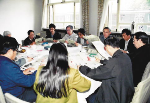 黃鴻森先生(后排左二)上世紀(jì)90年代初作為專(zhuān)家評(píng)委,參加由本報(bào)舉辦的全國(guó)報(bào)紙編校質(zhì)量抽查評(píng)比活動(dòng)。