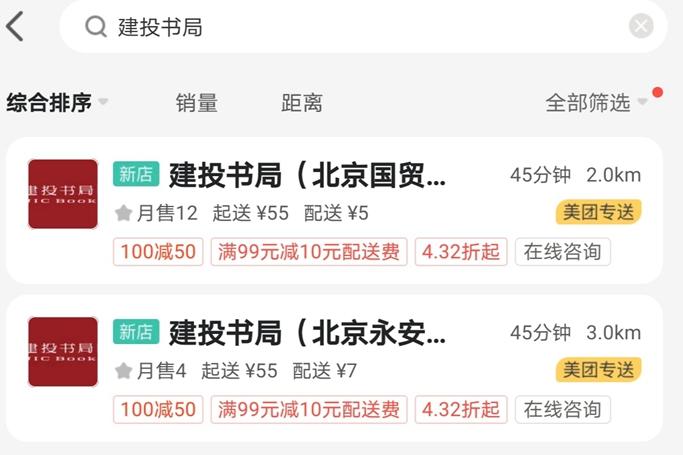在外賣平臺(tái)上搜索可以發(fā)現(xiàn),不同書店標(biāo)注的起送價(jià)格不同,同時(shí)也會(huì)顯示店面與用戶的距離,以及需要的配送時(shí)間等信息。