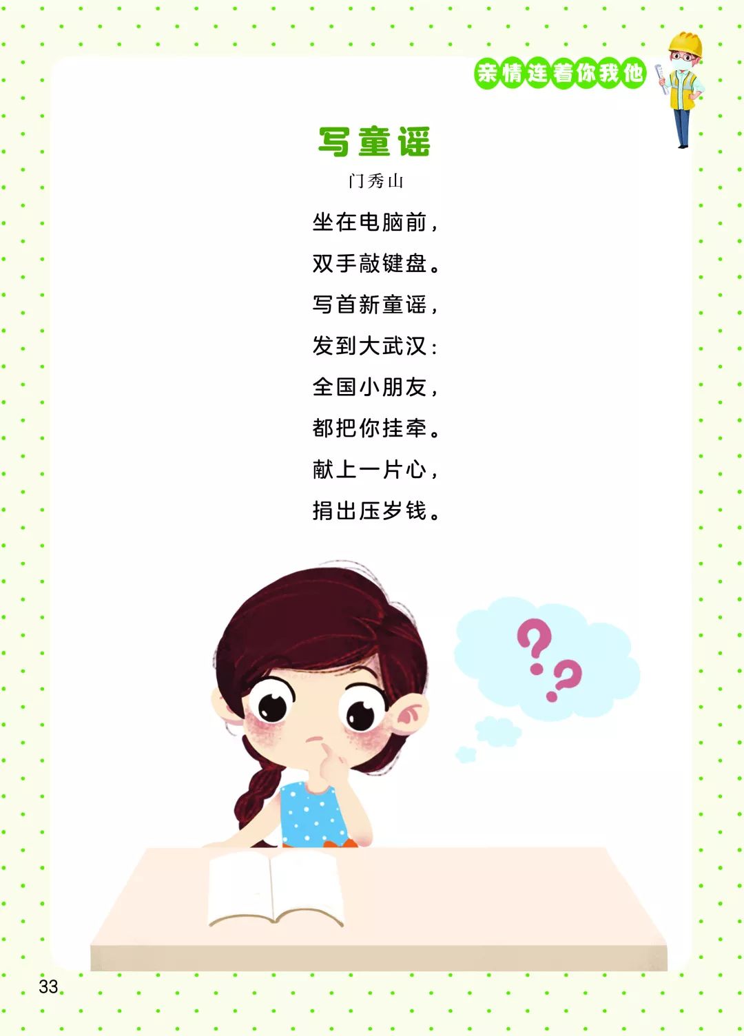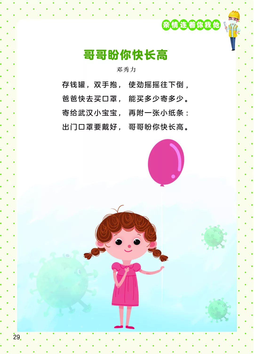 讀者出版?zhèn)髅焦煞萦邢薰舅鶎俑拭C少年兒童出版社積極響應(yīng)、主動作為,聯(lián)合“葫蘆文產(chǎn)”,策劃了《投降吧,新冠病毒——2020戰(zhàn)“疫”童謠60首》一書,將這些優(yōu)秀的童謠作品進行編輯加工,以期提高兒童科學(xué)防護意識,幫助大家堅定抗“疫”勝利的信心。本書通過數(shù)字版向讀者免費推送,為打贏這場疫情防控阻擊戰(zhàn)貢獻一份力量。