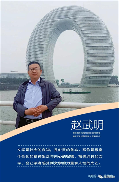 懷瑾握瑜,勤耕不輟。趙武明的寫作是安靜的,由于從事20余年的新聞工作,給他貯存了很多素材,所以他涉獵的寫作范疇很廣,寫散文隨筆、文藝評論、紀錄片、微電影、大型晚會總撰稿,還研究網(wǎng)絡文學。如果說文字是會呼吸的,趙武明的文字除了唯美,更多的是硬骨錚錚,也不乏柔腸的峻厲和倬約,風姿獨具,淡雅濃烈,相得益彰,簡約獨立,一語千里,蘊含張力。他常說,寫作要穿透人心抵達靈魂。向外,不斷追求生命更高的境界;向內(nèi),不斷觸及心靈。