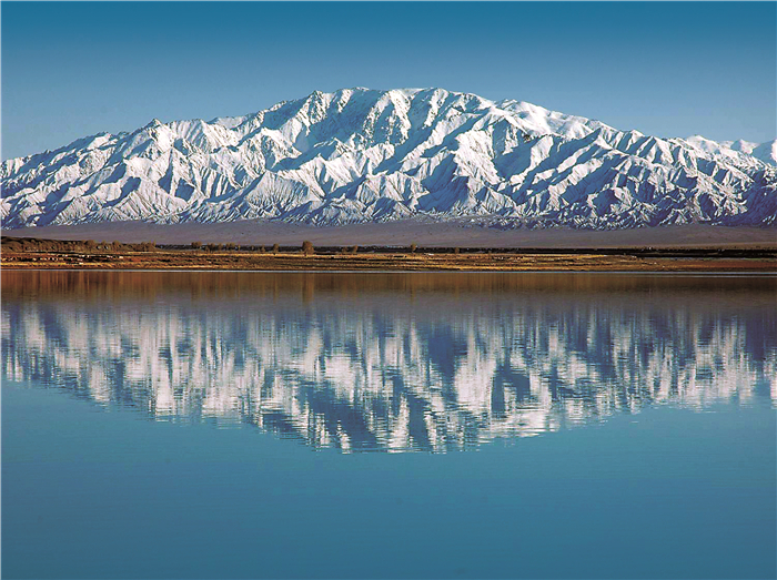 國(guó)道蜿蜒山寂靜,渾是冰雪嶺。疊嶂復(fù)層巒,瀚海藍(lán)天,雙塔妝湖鏡。